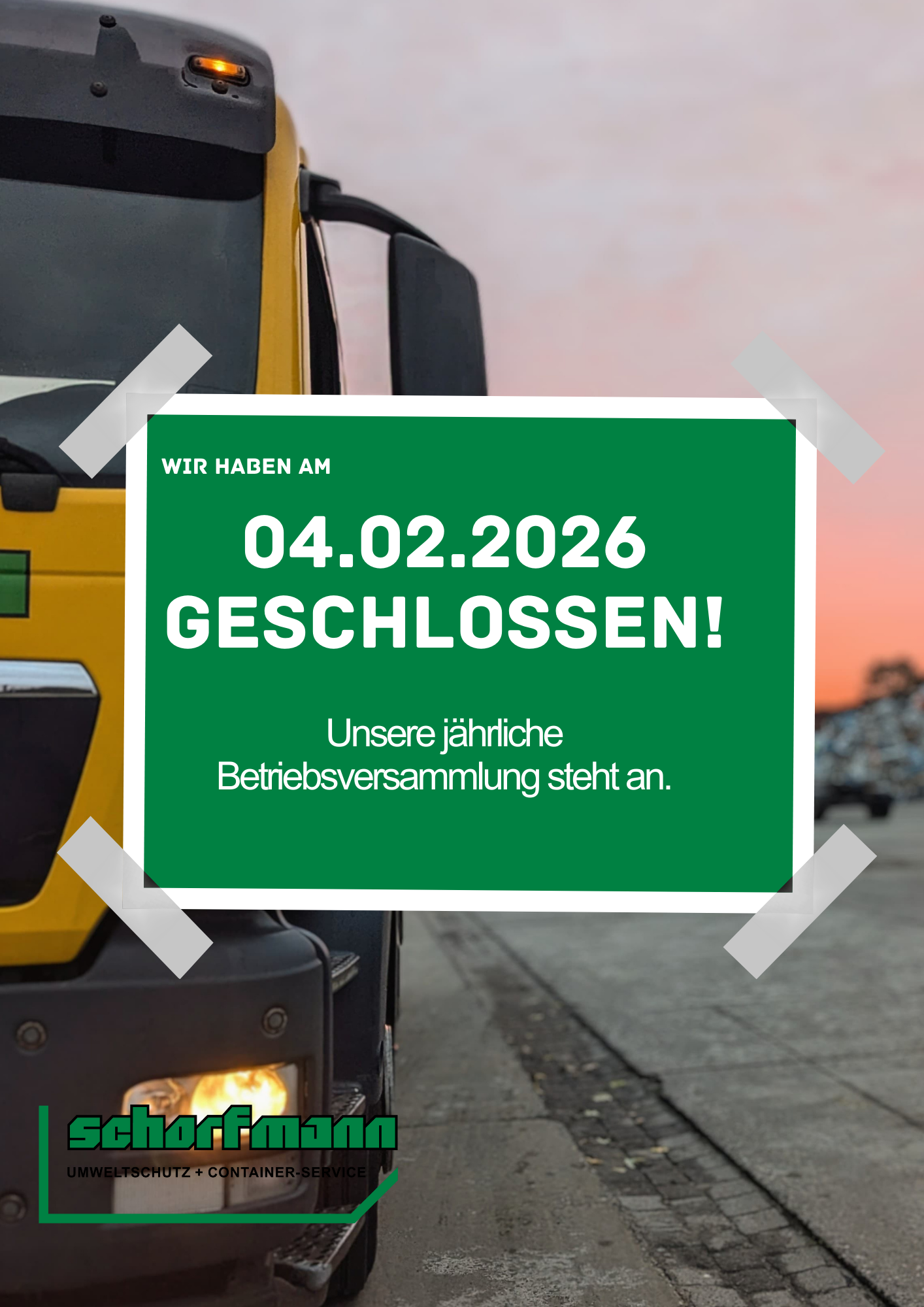 kurze Serviceinfo, am 04.02. bleibt unser Recyclinghof wegen unserer Betriebsversammlung geschlossen.